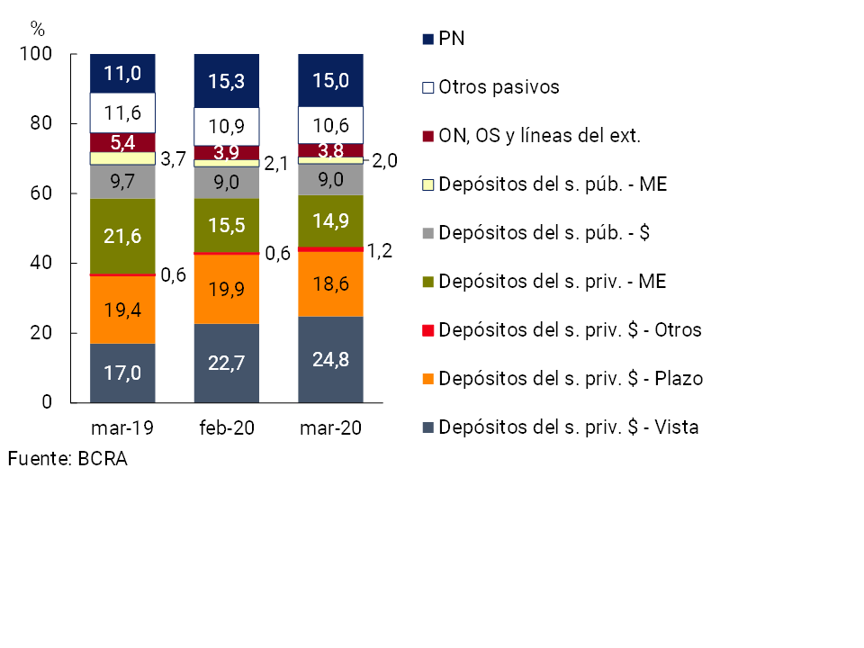A partir de este desempeño, en marzo la importancia relativa de los depósitos del sector privado en el fondeo total —pasivo y patrimonio neto— alcanzó59,6%, incrementándose 0,9 p.p. con respecto a febrero y en una comparación interanual (ver Gráfico 4).