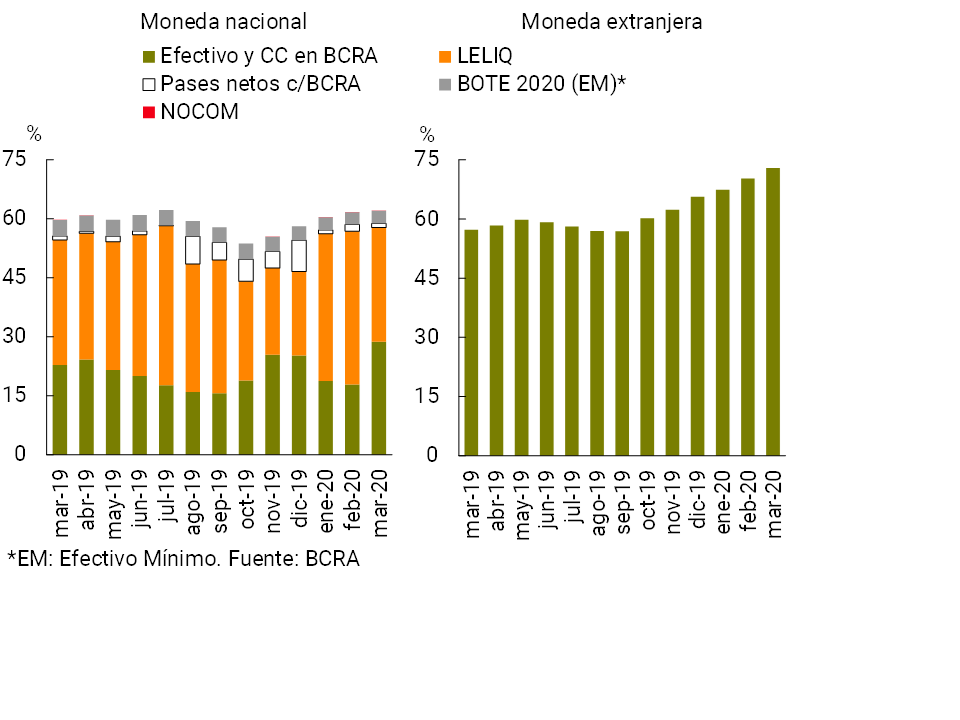 • El saldo de depósitos en pesos del sector privado aumentó 5,8% en términos reales en marzo (+9,4% nominal), por el desempeño de las cuentas a la vista (+11,8% real, +15,6% nominal), mientras que los depósitos a plazo se redujeron (-4,3% real, -1,1% nominal). Este desempeño estuvo influido por el ASPO, a partir de una mayor demanda de liquidez, sumada a la imposibilidad de efectuar depósitos de manera presencial (parte de los vencimientos de plazos fijos se reflejó en aumento saldos inmovilizados). Los depósitos del sector privado en moneda extranjera cayeron 2,2% —en moneda de origen— en el mes. La importancia relativa de los depósitos del sector privado en el fondeo total alcanzó 59,6%, incrementándose 0,9 p.p. con respecto a febrero.