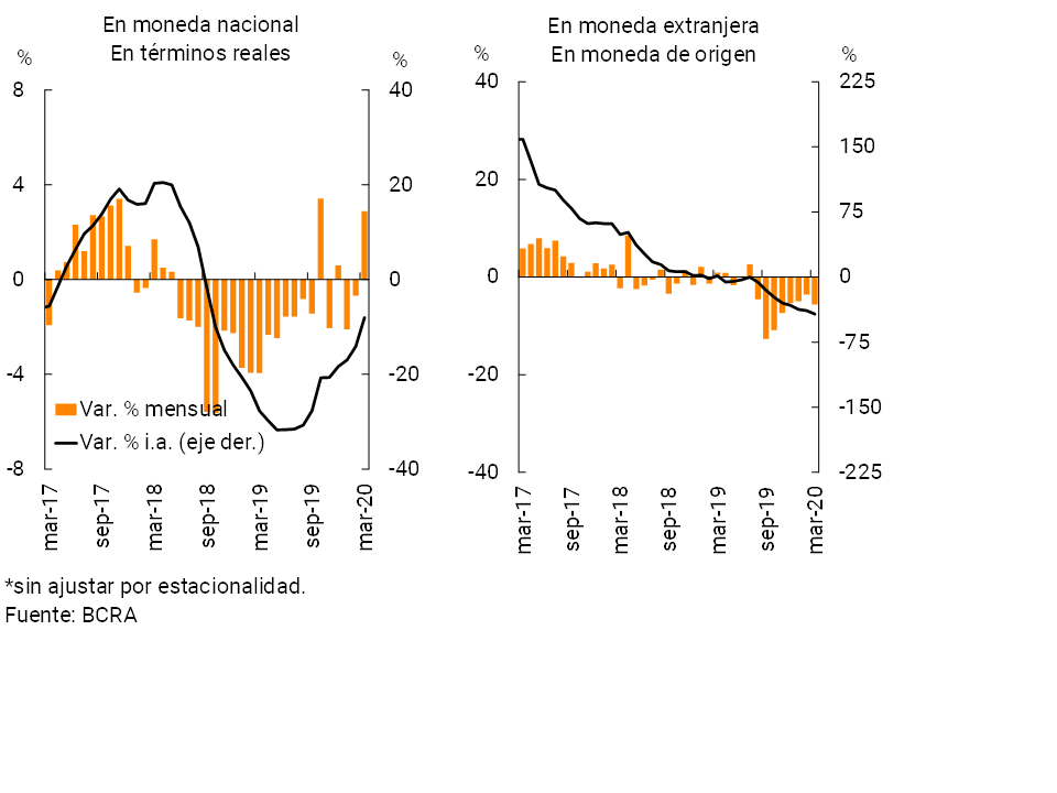 En una comparación interanual, el crédito en moneda nacional al sector privado acumuló una caída de 8,1% real, mientras que el saldo de los préstamos en moneda extranjera se redujo 42,6% —en moneda de origen—.