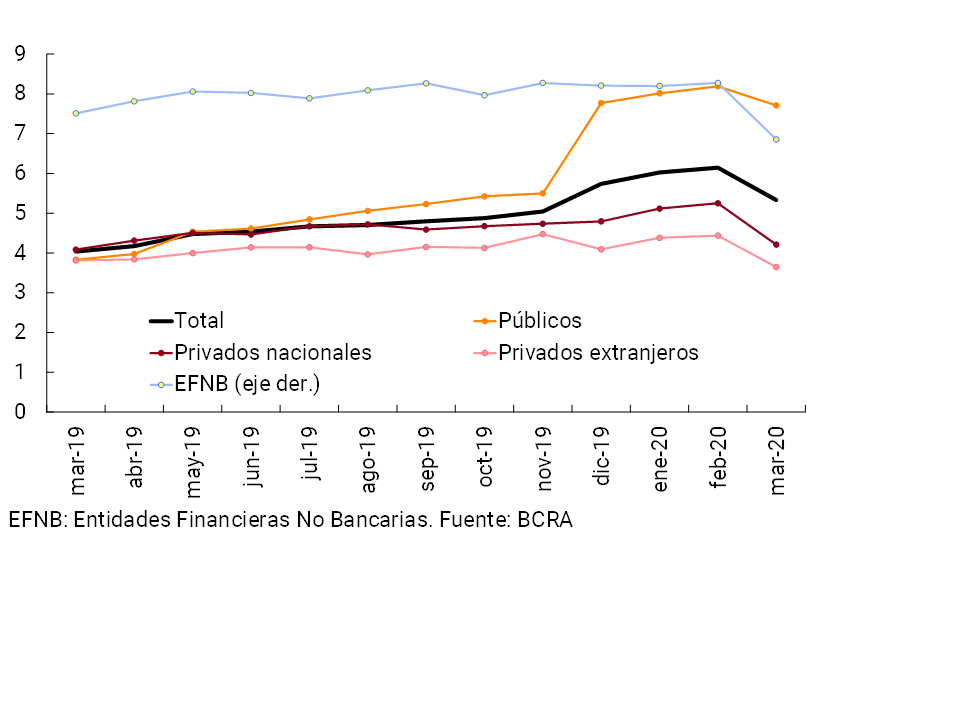 • En marzo el saldo de financiamiento bancario al sector privado en pesos aumentó 2,9% real (+6,3% nominal), fundamentalmente por el comportamiento de los adelantos y documentos, dadas las mayores necesidades de liquidez de las empresas, y en el marco de las medidas implementadas por el BCRA tendientes a mejorar las condiciones de acceso al crédito. Por su parte, los préstamos en moneda extranjera disminuyeron 5,6% —en moneda de origen—. La ponderación del crédito en el activo total del sistema se ubicó en 36,2%, reduciéndose 3,2 p.p. respecto al mes anterior.