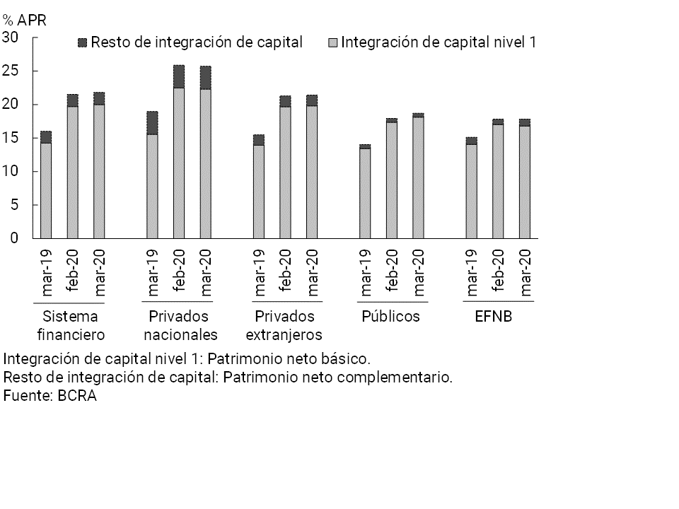 • Los indicadores de solvencia del sistema financiero aumentaron en marzo. La integración de capital (RPC) del sistema se ubicó en 21,8% de sus activos ponderados por riesgo (APR), 0,3 p.p. más que el mes pasado. La posición regulatoria de capital (RPC menos exigencia) para el agregado de entidades alcanzó 153% de la exigencia en marzo, aumentando 4,9 p.p. en el mes.