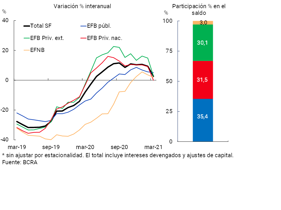 Considerando las partidas en moneda extranjera, el saldo de crédito en esta denominación se incrementó 7,2% en marzo —en moneda de origen—, impulsado principalmente por el desempeño de las financiaciones a la exportación de las entidades privadas extranjeras10, tras el mantenimiento de un tipo de cambio real competitivo y estable. Como resultado, el saldo de financiamiento total (en moneda nacional y extranjera) al sector privado disminuyó 2,4% real respecto a febrero (-5,9% i.a. real).