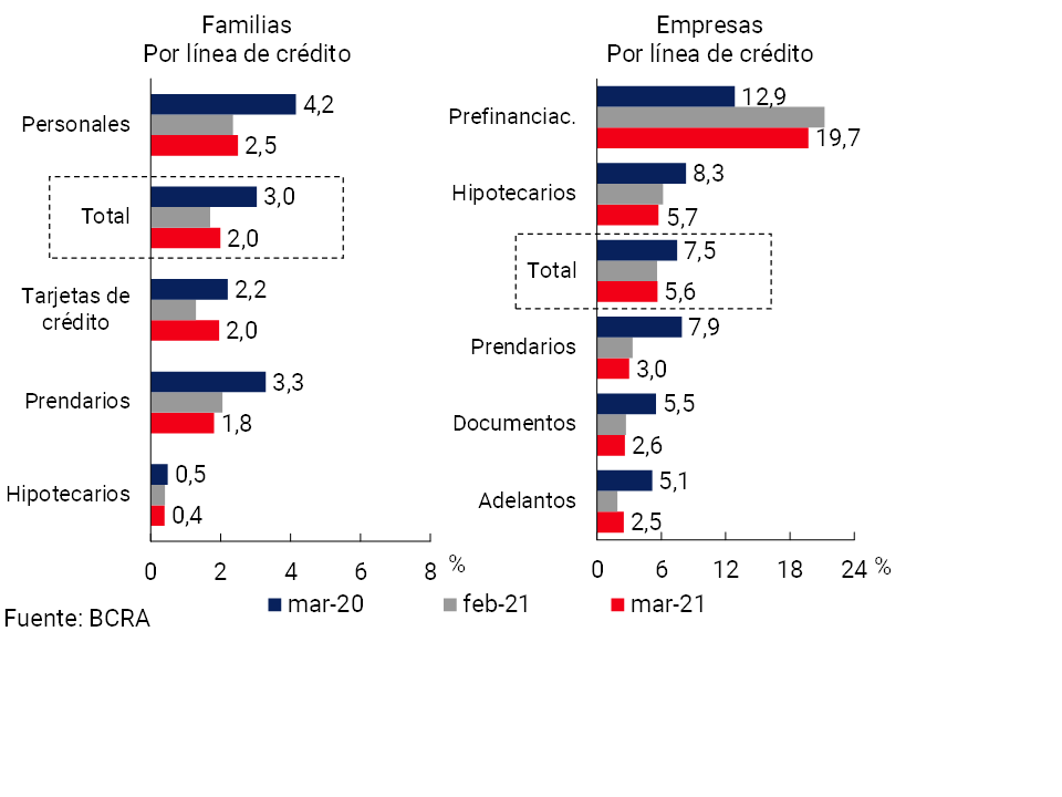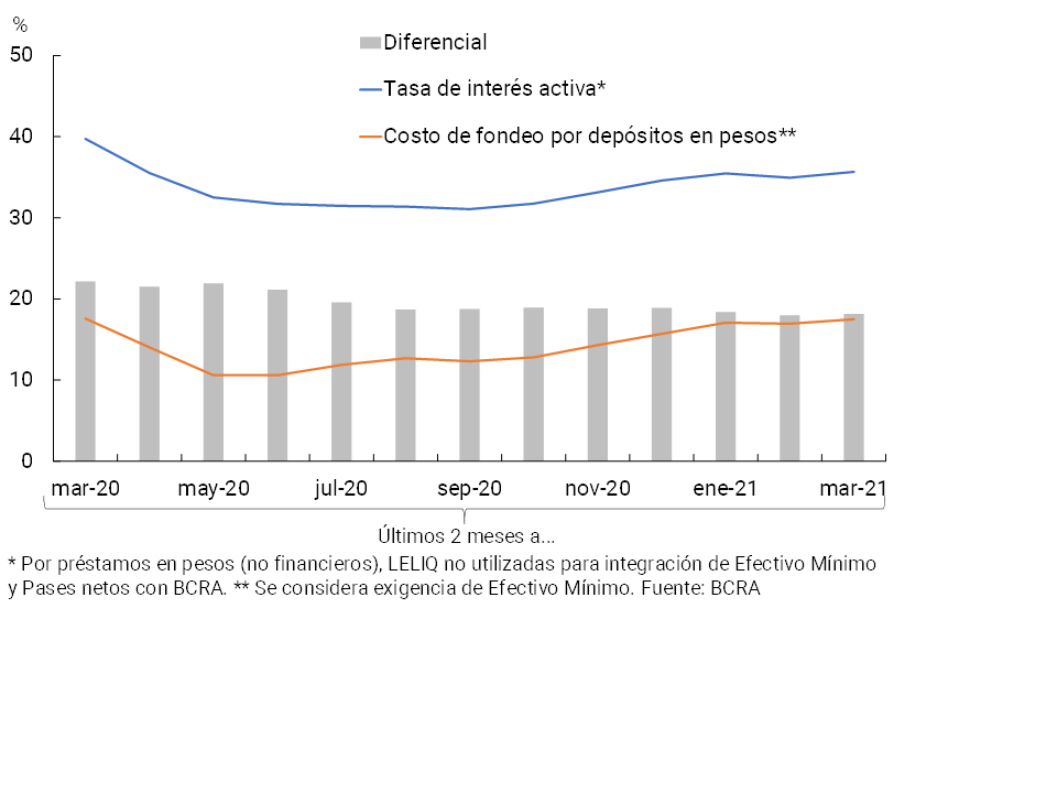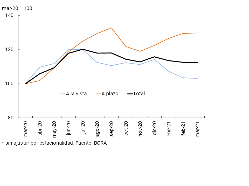 En marzo se redujo la actividad de intermediación del sistema financiero con el sector privado en moneda nacional en términos reales. En este sentido, cabe mencionar que la recuperación sostenida de la actividad económica hasta comienzos de año, favorecida por las medidas de estímulo del gobierno nacional y del BCRA, el retorno a la actividad de diversos sectores y el comienzo de la vacunación, se vio atemperada por el agravamiento del cuadro sanitario a partir de marzo.