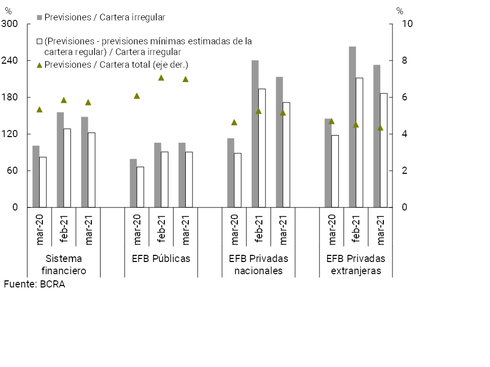 Las previsiones contabilizadas por el sistema financiero agregado representaron 5,7% del crédito total al sector privado en marzo, levemente por debajo del registro del mes anterior (+0,4 p.p. i.a., ver Gráfico 13). Las previsiones totales en términos de la cartera irregular se ubicaron en 148% en el mes. A su vez, en marzo el saldo de previsiones regulatorias atribuibles a la cartera irregular (siguiendo los criterios de las normas de previsiones mínimas regulatorias por riesgo de incobrabilidad) totalizó 122% de dicha cartera.