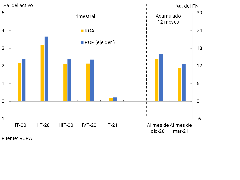 • En el primer trimestre de 2021 los resultados integrales en moneda homogénea devengados por el sistema financiero agregado fueron equivalentes a 0,2% anualizado (a.) del activo (ROA) y a 1,3%a. del patrimonio neto (ROE), por debajo de los registros de todo 2020. Considerando el acumulado de doce meses a marzo, el sector registró un ROA de 1,9% (ROE de 12,7%).