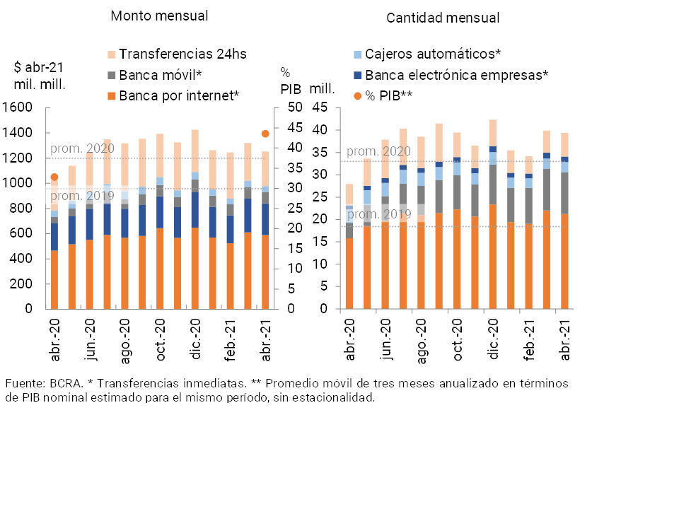Durante abril las transferencias totales en pesos (inmediatas y con acreditación en 24 horas) disminuyeron respecto al mes anterior, si bien se mantienen en valores superiores al promedio mensual de 2020. Más aún, con relación al mismo mes del año anterior, las transferencias totales en pesos aumentaron 41% en cantidades y 17,3% en montos reales (ver Gráfico 18) en parte como reflejo de ciertos cambios de hábitos en el marco de la pandemia. Las transferencias inmediatas impulsaron este desempeño, destacándose la expansión relativa de las operaciones cursadas por las familias a través de la banca móvil (+98% i.a. en montos reales) y de la banca por internet (+26,5% i.a.), seguido por las operaciones de la banca electrónica de empresas (+13,8% i.a.). En particular, dentro de las transferencias cursadas a través de la banca móvil, las billeteras de entidades financieras públicas (Cuenta DNI y BNA+) explicaron el 40% de la cantidad de operaciones cursadas en abril. A partir de este desempeño, se estima que el monto operado mediante transferencias totales creció 10,7 p.p. del PIB en una comparación interanual, hasta alcanzar 44% en abril de 2021. Se espera que se mantenga la tendencia observada de crecimiento de las operaciones mediante transferencias inmediatas en los próximos meses, tanto por los cambios de hábitos observados desde el inicio de pandemia, como por el impulso realizado por las entidades financieras y por el Banco Central en este sentido (lanzamiento del sistema de Pagos con Transferencias y los incentivos en términos de las exigencias de Efectivo Mínimo impulsadas por el BCRA para las operaciones realizadas electrónicamente -débitos en cuentas a la vista, ECHEQs y facturas de crédito-).