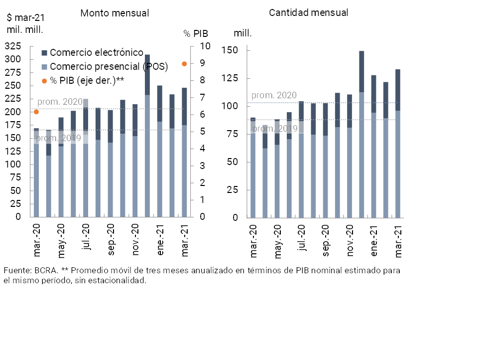 Durante marzo (última información disponible), las operaciones con tarjetas de débito aumentaron en cantidades y en montos reales respecto al mes inmediato anterior (ver Gráfico 19), observando un incremento relativamente mayor en las operaciones a través de comercio electrónico con relación a las operaciones presenciales. De esta manera, las operaciones en formato electrónico aumentaron su participación en el total (hasta totalizar 27,8% en cantidades y 29% en montos). En una comparación interanual, las operaciones con tarjetas de débito aumentaron significativamente (48% en cantidades y 45,4% en montos reales).