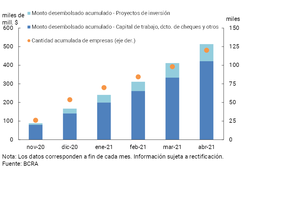 Paralelamente, a través de la línea de financiamiento a tasas de interés subsidiadas para empresas inscriptas en el “Programa de Asistencia de Emergencia al Trabajo y la Producción” (ATP)6, se llevan otorgados 20.912 préstamos por un total de $14.295 millones hasta fines de abril.