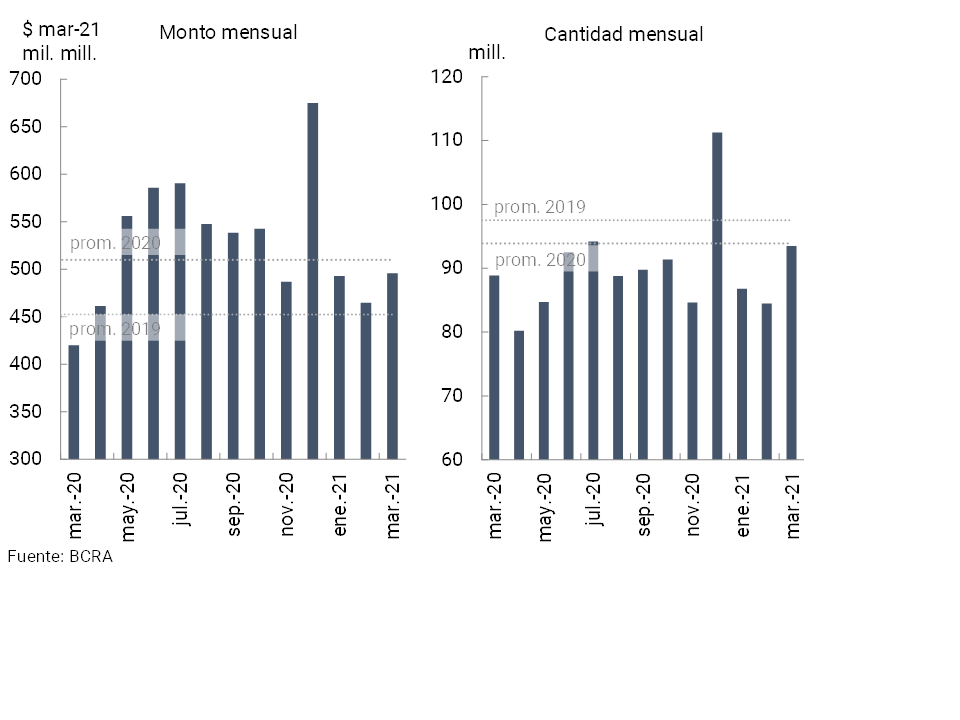 En marzo (última información disponible) y en el marco de factores estacionales se registró un mayor uso y retiro de fondos vía cajeros automáticos respecto al mes anterior (ver Gráfico 20). En términos interanuales se observó un aumento de 5,2% en la cantidad de extracciones de efectivo mediante cajeros automáticos y de 18% en los montos dispensados medidos en moneda homogénea.