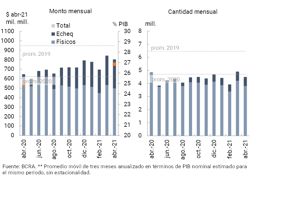Durante el mes de abril la compensación de cheques disminuyó con respecto a marzo en cantidades y en montos reales, manteniéndose en niveles similares al promedio mensual de 2020 (ver Gráfico 21). En el mes la compensación se redujo en sus dos formatos (ECHEQs y documentos físicos). Las operaciones mediante ECHEQs incrementaron su participación en el total compensado tanto en cantidades (hasta un 14,5%), como en montos (hasta un 36,9%). Con relación al mismo mes del año anterior, las operaciones totales mediante compensación de cheques disminuyeron en cantidades (-7,2%) y aumentaron en montos reales (24,2%).