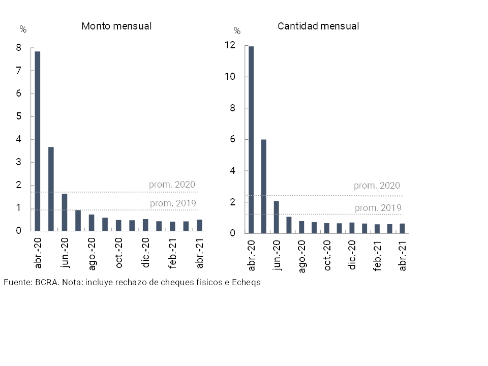 Durante el mes de abril, el rechazo de cheques por falta de fondos en términos del total compensado aumentó ligeramente respecto al mes anterior: en cantidades (+0,04 p.p., con un nivel de 0,64%) y en montos (+0,07 p.p., con un nivel de 0,5%). El ratio de rechazo por falta de fondos se mantiene debajo del promedio anual registrado en 2020. Con relación a los picos evidenciados en el mismo mes del año anterior, el ratio de rechazo disminuyó 11,3 p.p. en cantidades y 7,3 p.p. en montos (ver Gráfico 22).