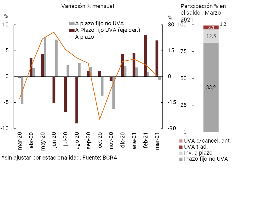 • El saldo real de los depósitos en pesos del sector privado se mantuvo sin cambios significativos en el mes (+4,8% nominal), con un incremento en los depósitos a plazo –tras mantenerse inalteradas las tasas mínimas- y una disminución en las cuentas a la vista. En línea con los diversos instrumentos de ahorro lanzados por el BCRA con cobertura por inflación, en marzo continuó destacándose el crecimiento de los depósitos a plazo en UVA, alcanzando un aumento mensual de 34,8% real para aquellos con cancelación anticipada y de 16,3% real para los depósitos UVA tradicionales. En términos interanuales, el saldo de los depósitos en pesos del sector privado acumuló un incremento de 12,6% real. Por su parte, en marzo el saldo de depósitos del sector privado en moneda extranjera se incrementó 1,6% —en moneda de origen—.