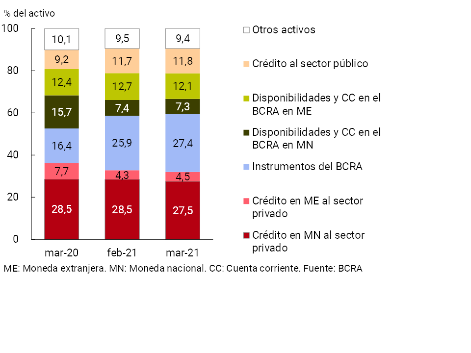 Respecto a la composición del activo total del sistema financiero, en marzo aumentó la ponderación de la tenencia de instrumentos de regulación monetaria y la relevancia del crédito al sector privado en moneda extranjera (ver Gráfico 7). Por su parte, en el mes el financiamiento en pesos al sector privado, atemperado tras el agravamiento de la pandemia, y las tenencias de las entidades financieras en las cuentas corrientes en moneda extranjera en el BCRA disminuyeron su importancia relativa en el activo total.