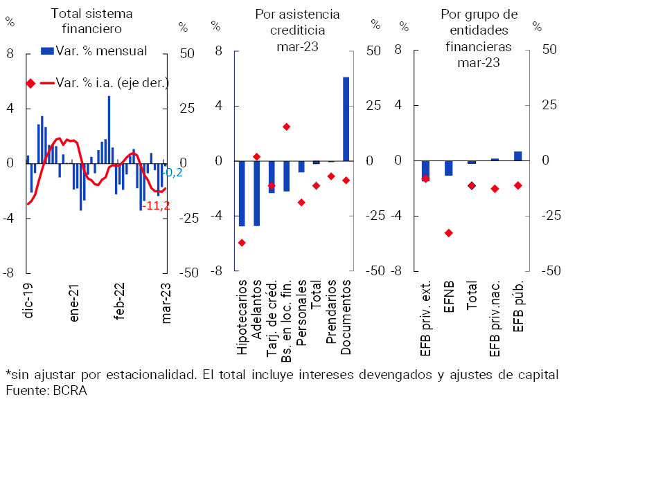 El saldo real de crédito en moneda nacional al sector privado no presentó cambios de magnitud con respecto a febrero (-0,2%, ver Gráfico 1)1. En marzo se registró un significativo aumento real en documentos, que prácticamente compensó la reducción en el resto de las asistencias. La variación interanual del saldo financiamiento en pesos continuó en niveles negativos.