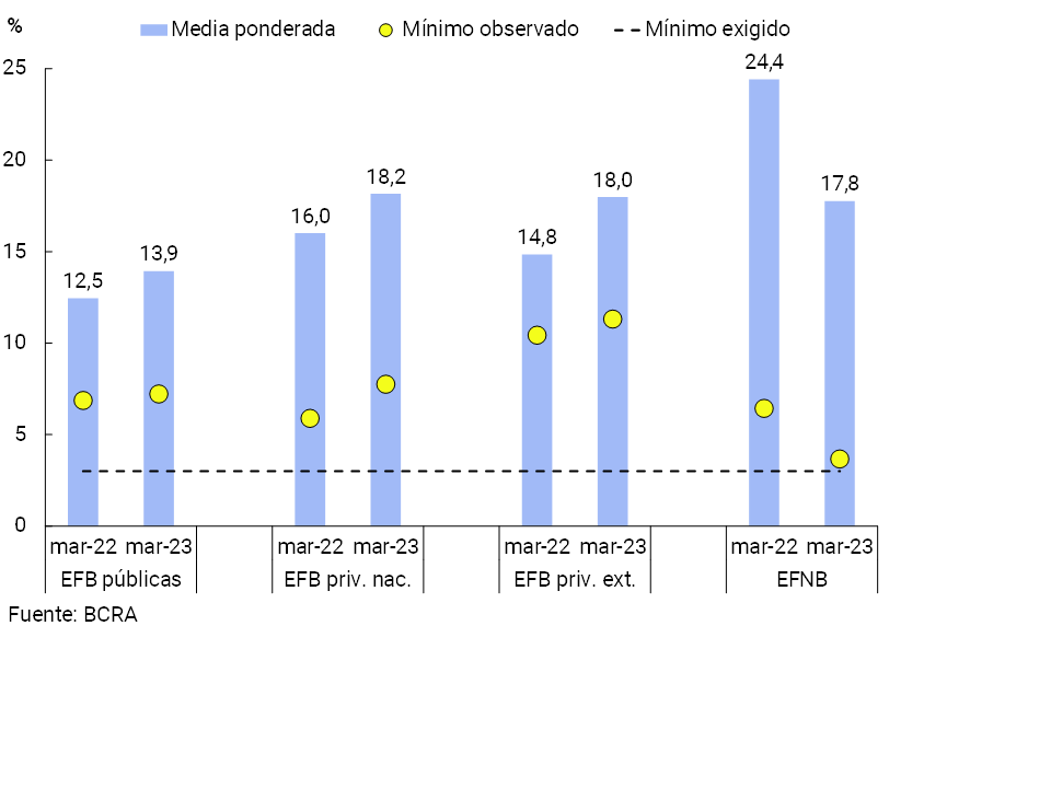 Los indicadores de solvencia del sector aumentaron levemente en el mes. La integración de capital regulatorio (RPC) del agregado de entidades se ubicó en 31,4% de los activos ponderados por riesgo (APR), 0,3 p.p. por encima del registro de febrero (+3,8 p.p. i.a.). El 96,8% de la RPC estuvo explicada por el capital de Nivel 1, que tiene mayor capacidad para absorber potenciales pérdidas. En marzo la posición de capital -capital regulatorio neto del requisito normativo mínimo- totalizó 292,6% de la exigencia a nivel sistémico (+47,3 p.p. i.a.) y 47,1% del saldo de crédito al sector privado neto de previsiones, por encima del promedio de los últimos 10 años (18,5%).