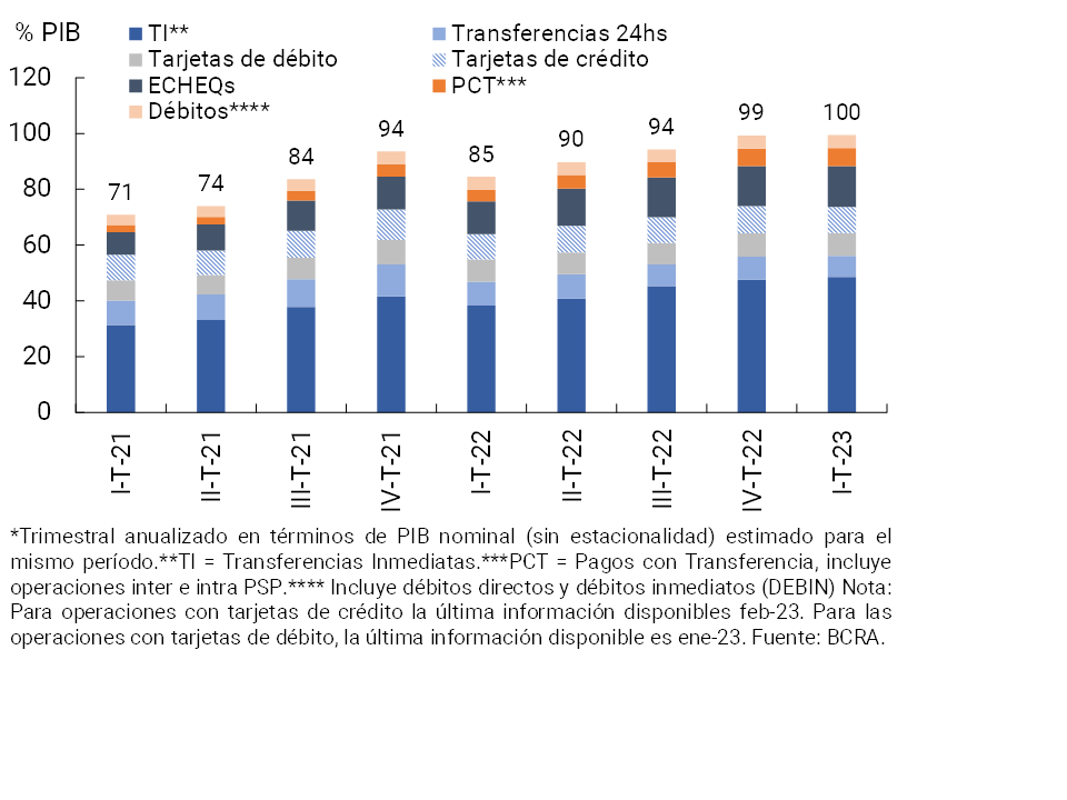 Los pagos con transferencia (PCT), cheques electrónicos (ECHEQs) y transferencias inmediatas (TI) fueron los instrumentos que ganaron mayor participación, ya sea tanto en el margen como en una comparación interanual. De esta manera las TI y los ECHEQs se consolidan como los instrumentos de mayor peso relativo (48,6% y 14,6% del PIB, respectivamente), mientras que los PCT paulatinamente van ganando protagonismo (6,5% del PIB)16.
