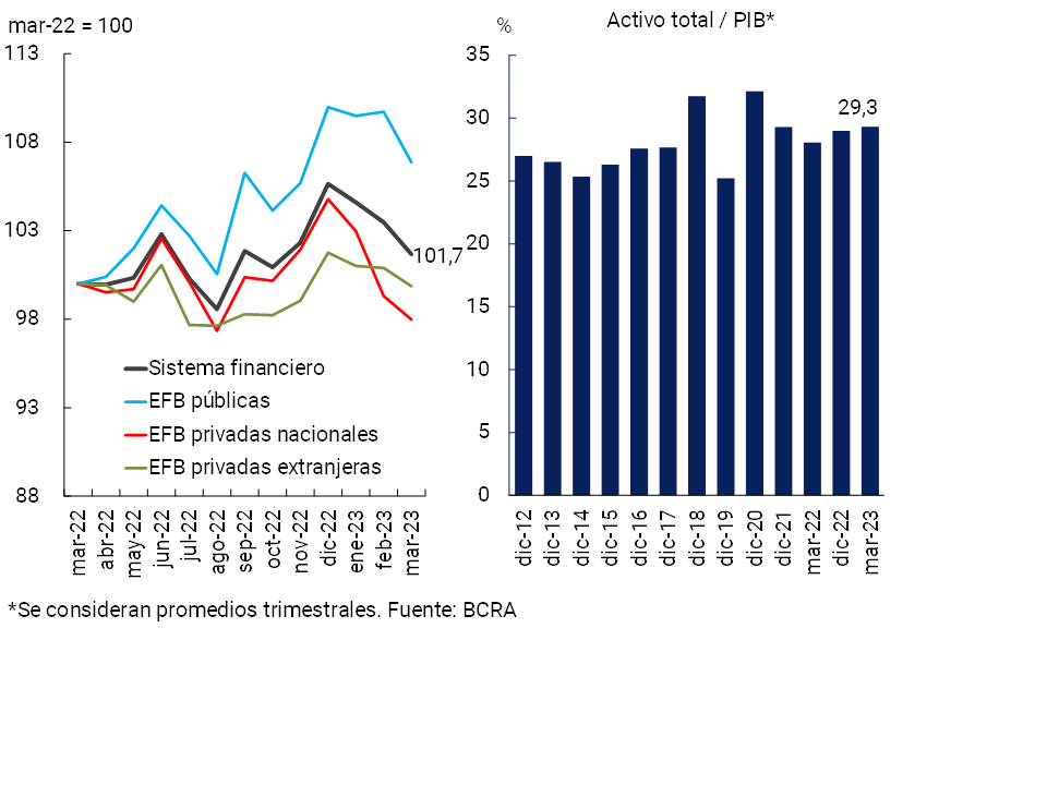 En marzo el activo total del conjunto de entidades financieras se redujo 1,7% en términos reales, ubicándose por encima del nivel de un año atrás (ver Gráfico 4). La disminución mensual del activo se verificó en todos los grupos de entidades financieras. Se estima que el activo agregado del sistema financiero representó 29,3% del PIB a fines del primer trimestre del año, superando tanto al nivel de marzo de 2022, como del promedio de los últimos 10 años (de 28,2%).