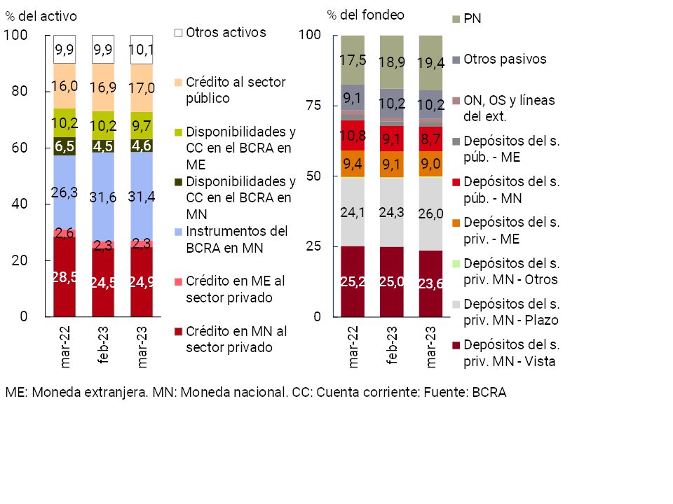 Respecto a la composición del activo total del sector, en marzo disminuyó la ponderación del saldo de las disponibilidades y de las cuentas corrientes en el BCRA, en tanto que aumentó la importancia relativa del crédito en pesos al sector privado (ver Gráfico 5). Por el lado del fondeo total, en marzo las cuentas a la vista en pesos del sector privado y los depósitos del sector público en igual denominación redujeron su relevancia. Por su parte, las colocaciones a plazo en pesos del sector privado y el patrimonio neto aumentaron su ponderación en el fondeo total en el período (ver Gráfico 5).