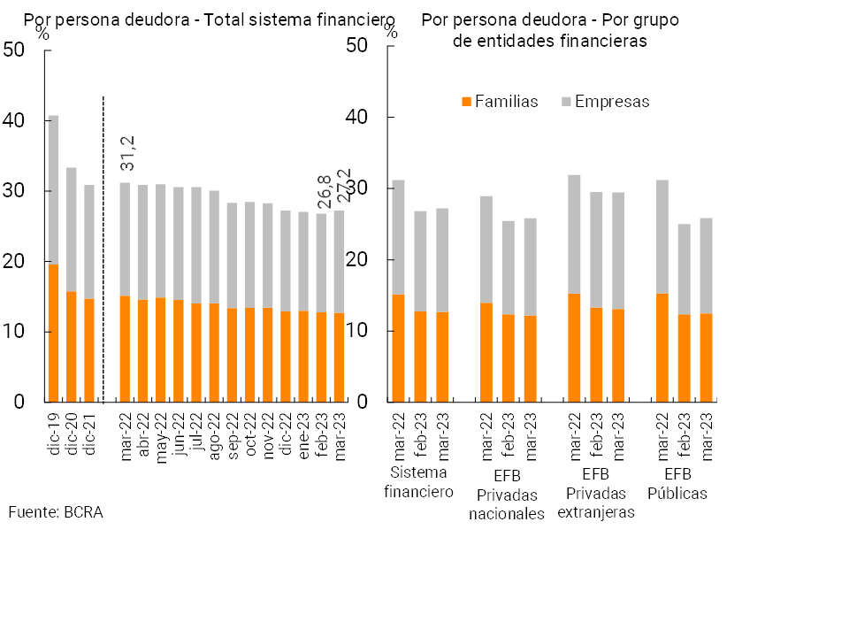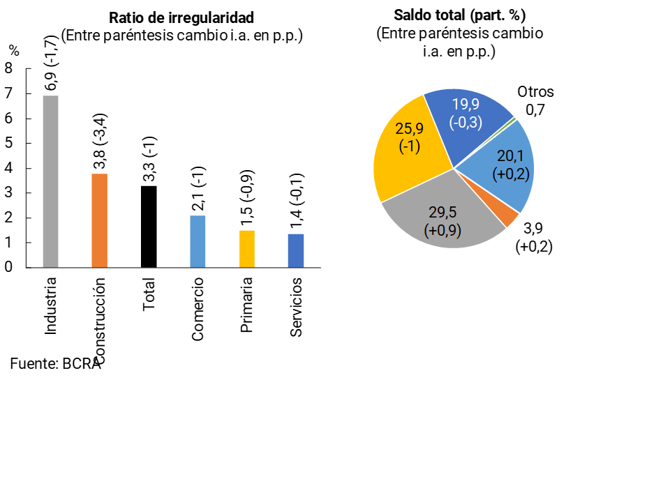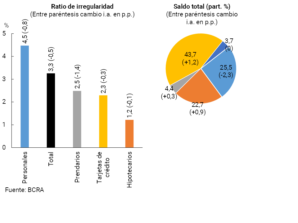 10 Considerando exclusivamente el financiamiento en pesos, el cociente entre el crédito a todo el sector privado y el activo se situó en 24,9% en el período (+0,4 p.p. mensual y -3,6 p.p. i.a.), mientras que el indicador para las partidas en moneda extranjera se ubicó en 2,3% del activo (sin cambios en el mes y -0,3 p.p. i.a.).