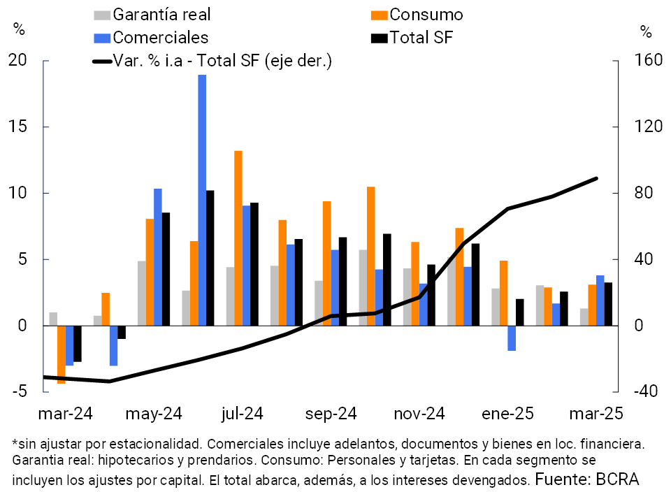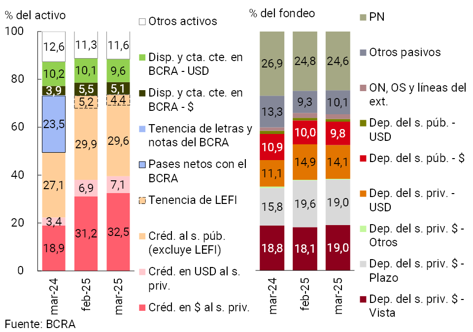 3 En marzo el crédito total a las familias y empresas neto de previsiones totalizó 38,5% del activo, 1,5 p.p. y 17 p.p. más que en febrero y el mismo período de 2024, respectivamente.