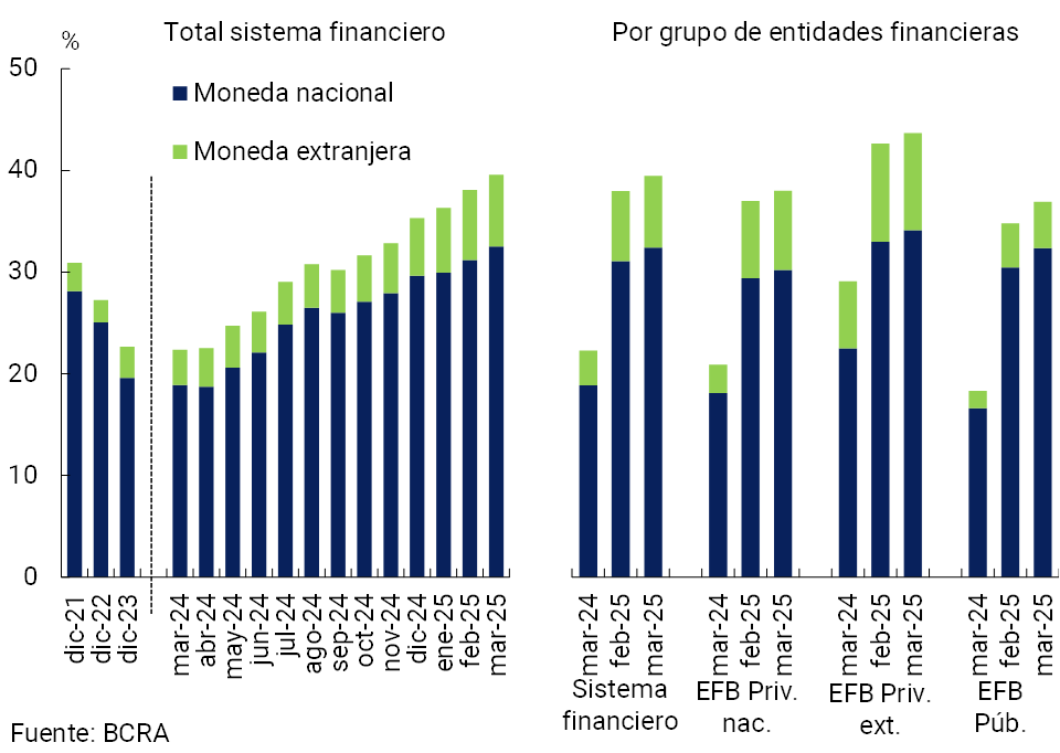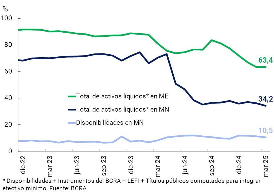 4 Considera disponibilidades (efectivo y cuenta corriente en el BCRA), letras fiscales de liquidez (LEFI), y el saldo de las especies de títulos públicos que las entidades computan como integración de Efectivo Mínimo (hasta mediados de 2024 incorporaba instrumentos del BCRA).