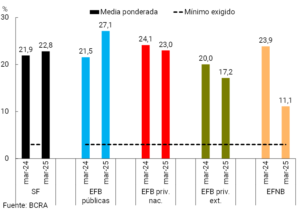 Los indicadores de solvencia para el conjunto de entidades se mantuvieron elevados en el cierre del primer trimestre. En marzo el ratio de integración de capital del sistema financiero totalizó 31,9% de los activos ponderados por riesgo (+2,9 p.p. respecto a febrero y -7,5 p.p. i.a.) y el de posición de capital alcanzó 297% de la exigencia regulatoria (+35 p.p. mensual y -99 p.p. i.a.). En el mes comenzaron a regir las modificaciones normativas oportunamente dispuestas por el BCRA sobre el cómputo de la exigencia por riesgo operacional (Comunicación A 8068), en sintonía con los lineamientos del Comité de Basilea.