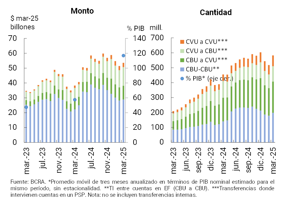En marzo las transferencias inmediatas (TI) mostraron una recuperación respecto a febrero. En los últimos doce meses las TI crecieron significativamente: 28% en cantidad y 39,4% en montos reales (ver ver Gráfico 13), con un mayor dinamismo relativo en las operaciones entre cuentas en proveedores de servicios de pago (CVU a CVU). 9 10En los últimos 12 meses, las TI continuaron ganando relevancia en la economía, representando 116,9% del PIB (+59,4 p.p. i.a.).
