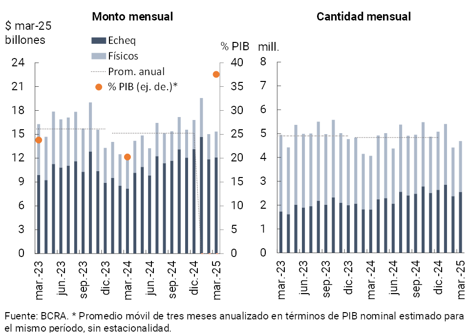 La compensación de cheques también se incrementó en el mes: +6,2% en cantidades y +2,2% en montos reales (ver ver Gráfico 14). 12 En términos interanuales, los ECHEQs continuaron consolidándose como la modalidad predominante, con un crecimiento de 40,3% i.a. en cantidades y de 48,3% i.a. en montos reales. Actualmente, los ECHEQs representan 54,4% del total de cheques compensados en cantidades y concentran el 78,8% de los montos. Este desempeño impulsó una mayor relevancia de la compensación de cheques respecto de la actividad económica total, alcanzando un nivel equivalente al 37,6% del PIB, lo que representa un incremento interanual de 17,3 puntos porcentuales.