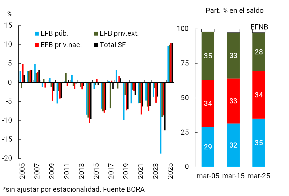 En el cierre del primer trimestre de 2025 continuó expandiéndose la intermediación financiera con el sector privado. En marzo el saldo real de crédito en pesos a empresas y familias creció 3,3% (88,9% i.a.), con aumentos en todos los grupos de entidades financieras. El saldo de crédito en moneda extranjera al sector privado aumentó 4% en el mes en moneda de origen (180,2% i.a.). Teniendo en cuenta todas las monedas (nacional y extranjera) el saldo real de financiamiento al sector privado se incrementó 2,9% respecto a febrero (94,5% i.a.). Con este desempeño mensual, el crecimiento real del crédito al sector privado durante el primer trimestre de 2025 (10,4%) superó las variaciones registradas para el mismo período en los últimos veinte años, tanto a nivel agregado como en todos los grupos de entidades financieras.