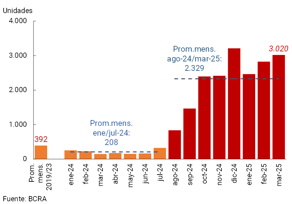 El saldo de crédito hipotecario en pesos al sector privado siguió creciendo en marzo: 1,5% real respecto a febrero (35,8% i.a. real) – incluyendo capital y ajuste de los préstamos en UVA- . En el mes se estima que más de 3.000 nuevos deudores hipotecarios se incorporaron al sistema financiero (altas de personas humanas, ver Gráfico 3), alcanzando un total de aproximadamente 19.600 nuevos deudores desde marzo de 2024.