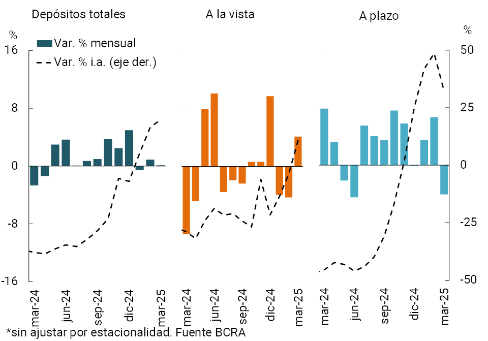 El saldo real de los depósitos en pesos del sector privado se mantuvo sin cambios de magnitud respecto a febrero (20,1% real i.a.). El saldo real de los depósitos a la vista en pesos aumentó 4,2% en el mes (11,4% real i.a.), mayormente por el segmento remunerado, mientras que el saldo real de los depósitos a plazo en pesos se redujo 4,1% en marzo (aunque aumentó 32,1% real i.a.).