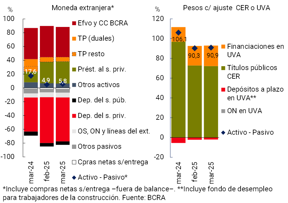 Al considerar los rubros cuyo capital ajusta por CER (o pactados en UVA), se estima que los activos del sistema financiero representaron 20,5% del total a marzo (-0,2 p.p. en el mes y -4,6 p.p. i.a.), en tanto que los pasivos totalizaron sólo 0,4% del fondeo total (-0,1 p.p. mensual y -0,8 p.p. i.a.). En el mes la diferencia estimada entre estos activos y pasivos se ubicó en 90,9% del capital regulatorio del sistema financiero (+0,7 p.p. mensual y -15,1 p.p. i.a., ver ver Gráfico 6).