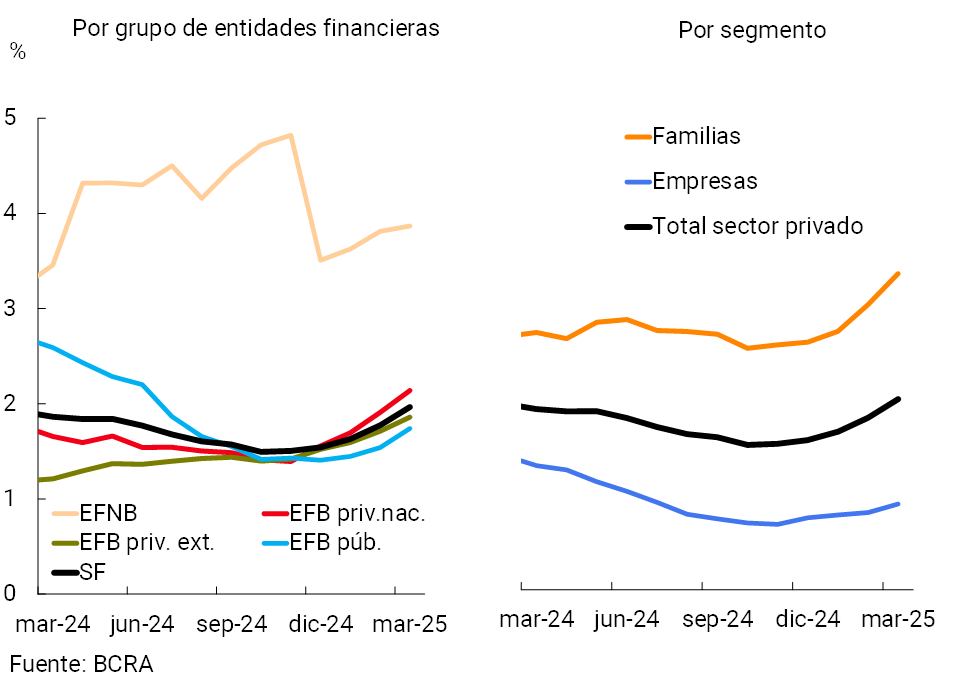 El ratio de irregularidad del crédito al sector privado totalizó 2% para el sistema financiero en marzo, 0,2 p.p. más que en febrero (ver ver Gráfico 8). La dinámica mensual de este indicador resultó generalizada entre los distintos grupos de entidades y tipos de deudores. En el cierre del primer trimestre el coeficiente de mora de las financiaciones a las familias se ubicó en 3,3% (+0,3 p.p. mensual) y el de los créditos a las empresas en 0,9% (+0,1 p.p. mensual). En términos interanuales el ratio de irregularidad del crédito a todo el sector privado no presentó cambios de magnitud (+0,1 p.p.).