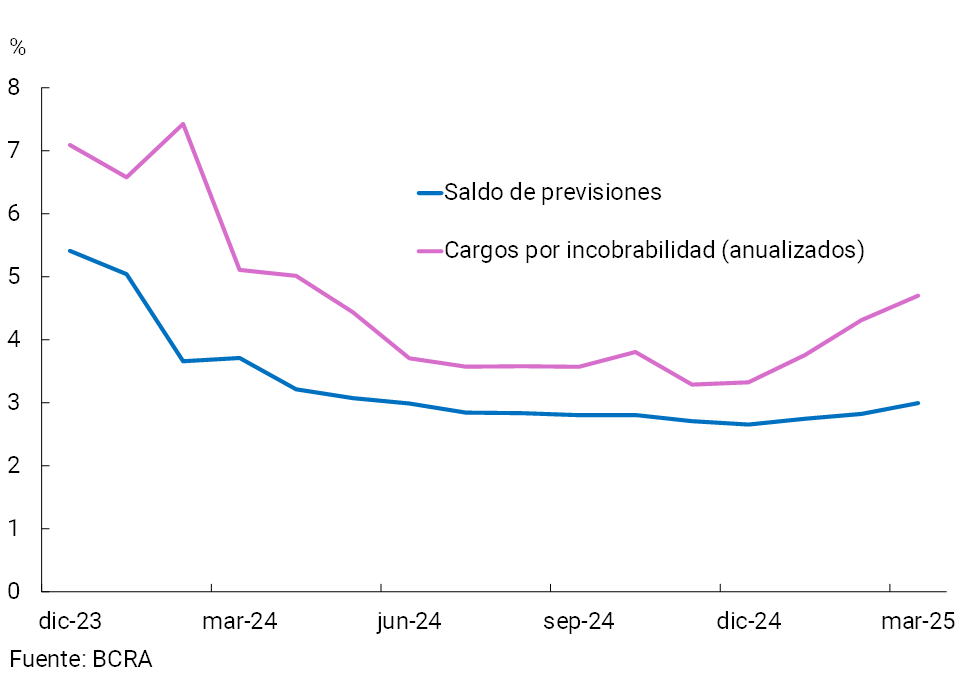 El cociente entre los cargos por incobrabilidad (anualizados -a.-) y el saldo de crédito al sector privado para el sistema financiero también creció en el mes: 0,4 p.p. hasta 4,7%a. Respecto al cierre de 2024 este indicador aumentó 1,4 p.p. (ver ver Gráfico 9), no obstante, se ubicó 0,4 p.p. por debajo del registro de marzo de 2024.