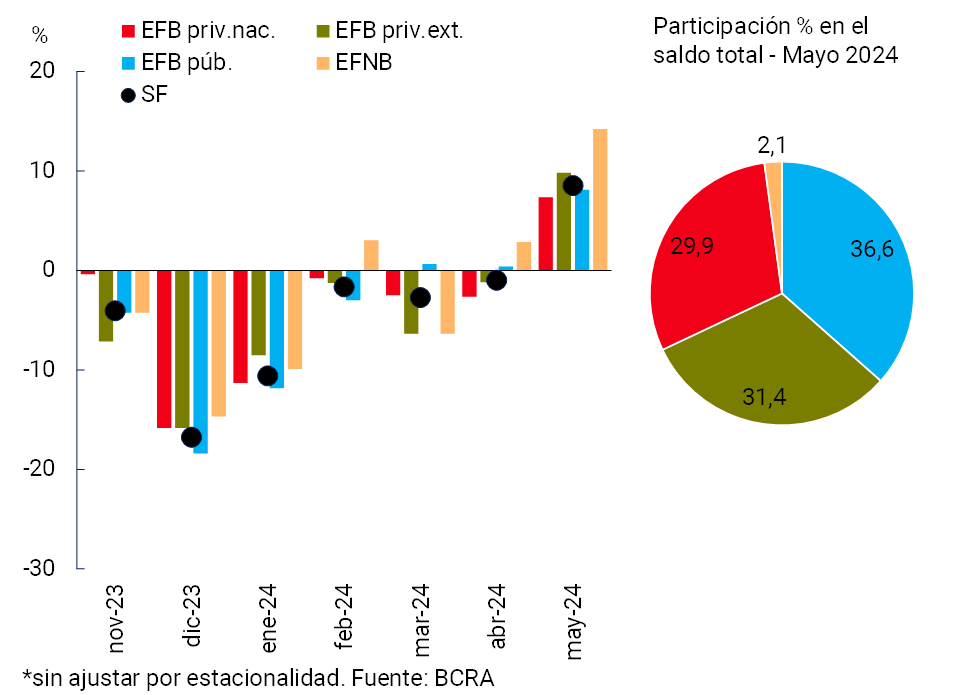 • El saldo de financiamiento en pesos al sector privado se incrementó 8,5% real) en mayo (luego de 6 meses consecutivos de caída), con aumentos en todas las líneas crediticias y grupos de entidades financieras. El saldo de financiaciones en moneda extranjera creció 9,8% (+54,7% i.a.), dinamizado mayormente por las líneas comerciales.