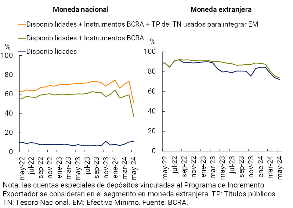 1 En el marco de la estrategia de saneamiento del balance del BCRA, en mayo se promovió la administración de liquidez de corto plazo a través del desarme de posición de pasivos remunerados del BCRA (cuya tasa de interés fue reduciéndose hasta 40%) por títulos del Tesoro (principalmente LECAP). Para mayor detalle ver Nota de Prensa del 16/05/2024 y el Informe Monetario Mensual de mayo 2024.