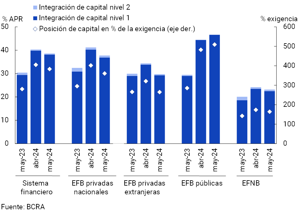 • El ratio de integración de capital regulatorio (RPC) se ubicó en 38,6% de los activos ponderados por riesgo (APR) para el conjunto de entidades en mayo (-1,7 p.p. mensual ó +8,2 p.p. i.a.). El exceso del capital regulatorio (RPC menos exigencia mínima normativa) representó a nivel sistémico 383% de la exigencia y 75,2% del crédito al sector privado neto de previsiones.