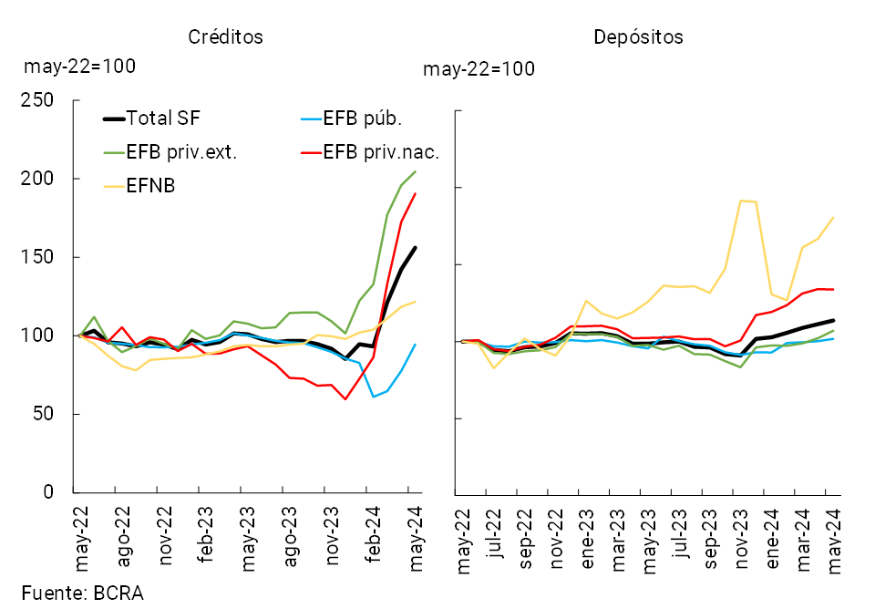 La actividad de intermediación financiera con el sector privado presentó un desempeño positivo en mayo, con aumentos de los saldos reales de los créditos y depósitos tanto en pesos como en moneda extranjera.
