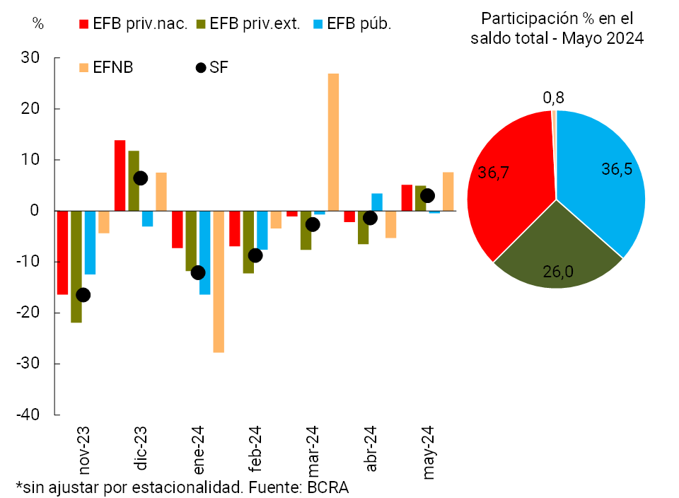 En cuanto al segmento en moneda extranjera, el saldo de financiamiento al sector privado aumentó 9,8% en mayo (ver Gráfico 2), impulsado por las entidades financieras públicas y las privadas nacionales4. El desempeño mensual fue dinamizado mayormente por las líneas comerciales (los documentos y las prefinanciaciones a la exportación explicaron casi el 90% del aumento en el período)5. En este escenario, el saldo de financiamiento total (en moneda nacional y extranjera) al sector privado creció 8,4% real (+12,9% nominal) respecto al mes anterior (-20% real en una comparación interanual).