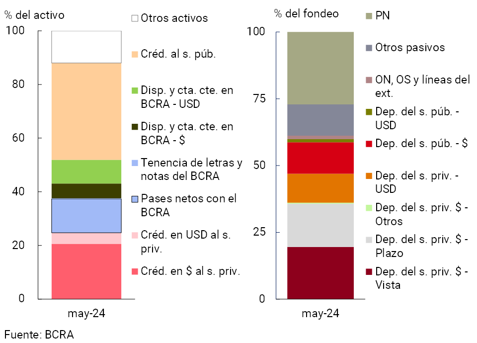 De acuerdo con la redefinición del marco normativo que promueve la administración de liquidez de corto plazo a través de títulos del Tesoro en reemplazo de pasivos remunerados del BCRA, en mayo disminuyó el peso de los pases netos con el BCRA en el activo total de las entidades financieras (hasta 12,6%) y aumentó la importancia relativa del financiamiento al sector público no financiero (hasta 36,1%, ver Gráfico 4). Por su parte también aumentó la ponderación en el activo del crédito en pesos al sector privado, y las disponibilidades y cuentas corrientes en el BCRA en igual denominación8. En cuanto a la composición del fondeo total, en el mes se redujo la participación del patrimonio neto en el total (hasta 27,1%), mientras que las cuentas a la vista en pesos del sector privado y los depósitos del sector público en moneda nacional aumentaron su importancia relativa (hasta 19,6% y 11,8% respectivamente)9.