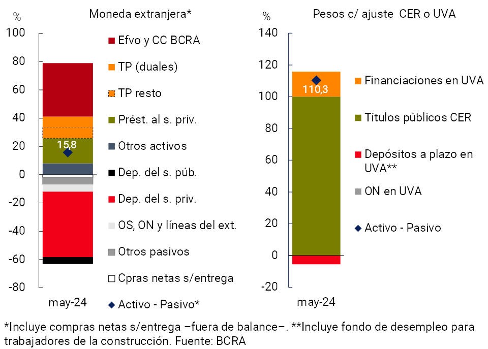 En un contexto en el cual el saldo de préstamos, títulos públicos y depósitos en moneda extranjera creció en el mes, el diferencial estimado entre activos y pasivos en dicha denominación10 aumentó en mayo 2 p.p. del capital regulatorio, hasta ubicarse en 15,8% (-16,8 p.p. i.a., ver Gráfico 5). Por su parte, el diferencial estimado entre las partidas del balance en pesos con ajuste de capital por CER (o que se pactan en UVA) se incrementó 5,4 p.p. de la RPC a nivel agregado en el mes, hasta totalizar 110,3% (+46 p.p. i.a.).