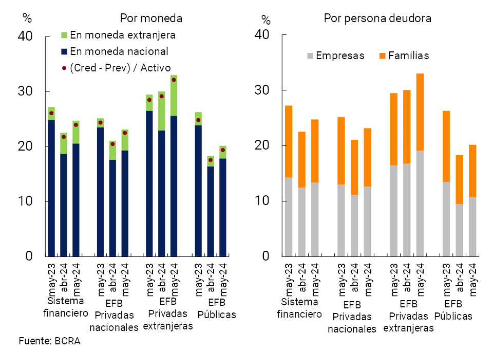 En mayo la exposición bruta del conjunto de entidades financieras al sector privado (en moneda nacional y extranjera) aumentó 2,2 p.p. del activo, hasta ubicarse en 24,7% (-2,5 p.p. i.a.; ver Gráfico 6). El desempeño mensual recogió el efecto del incremento del saldo real de crédito al sector privado, y en menor medida, de la disminución real del activo total del sector (ver Sección I y Sección II). El aumento de este indicador se reflejó tanto en el segmento destinado a las familias como a las empresas, y resultó generalizado en todos los grupos de entidades financieras bancarias. Considerando únicamente el segmento en pesos, la exposición bruta del sistema financiero al sector privado totalizó 20,6% (+1,9 p.p. mensual y -4,3 p.p. i.a.), mientras que alcanzó 4,1% (+0,3 p.p. mensual y +1,8 p.p. i.a.) para las partidas en moneda extranjera. Si se deducen las previsiones contables, el saldo de crédito total al sector privado representó 24% del activo en el período (+2,2 p.p. respecto a abril y -2,1 p.p. i.a.).