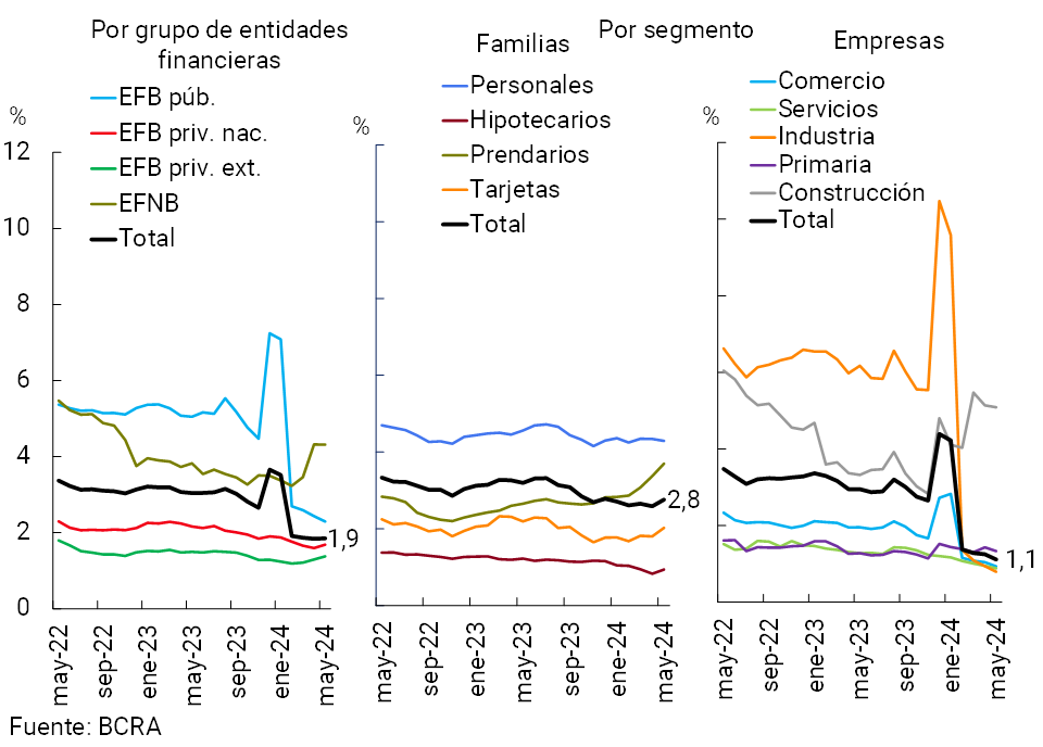 En mayo el ratio de irregularidad del crédito al sector privado se ubicó en 1,9%, manteniéndose sin cambios de magnitud respecto al mes pasado (-1,2 p.p. i.a.; ver Gráfico 7). La irregularidad de los préstamos a las empresas se redujo 0,1 p.p. en el período, hasta totalizar 1,1% (-1,8 p.p. i.a.), con leves caídas en todos los sectores económicos. Por su parte, el coeficiente de morosidad del crédito destinado a las familias aumentó 0,2 p.p., hasta situarse en 2,8% de dicha cartera (-0,4 p.p. i.a.), dinámica impulsada mayormente por los créditos prendarios y las financiaciones a través de tarjetas de crédito.