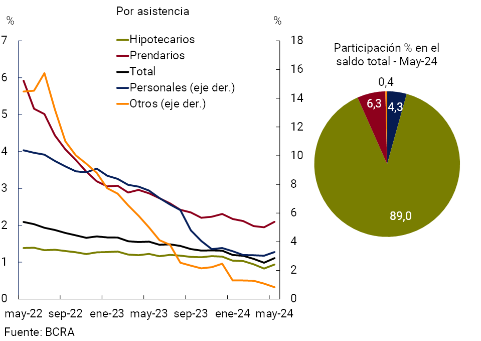 Dentro del segmento de crédito a los hogares, la irregularidad de aquellas financiaciones denominadas en UVA continuó en niveles muy acotados en el mes (1,1%, +0,1 p.p. respecto a abril y -0,4 p.p. i.a.). En particular, los préstamos con garantía hipotecaria, que a mayo representaron casi 90% del saldo total de financiaciones en UVA, exhibieron un ratio de mora de 0,9%, por debajo del nivel correspondiente a la cartera total mantenida con las familias (ver Gráfico 8).