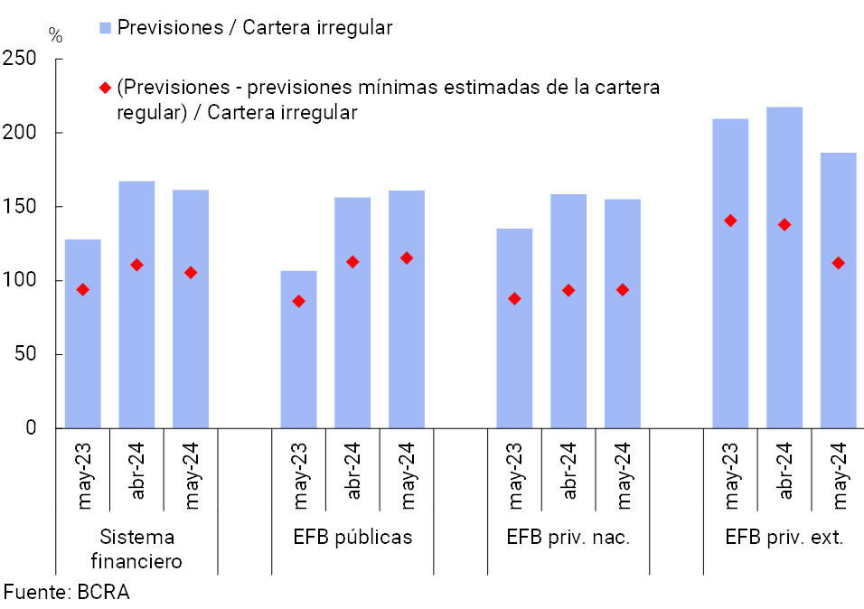 El sector siguió conservando holgados niveles de previsionamiento. Las previsiones contables representaron 161,4% de la cartera en situación irregular a nivel agregado, reduciéndose 6 p.p. en mayo, pero superando en 33,5 p.p. al nivel del mismo mes del año pasado (ver Gráfico 9). En el período, el saldo de previsiones atribuibles a la cartera en situación irregular continuó cubriendo más del saldo total de dicha cartera a nivel agregado, ubicándose en 105,5% (-5,2 p.p. mensual y +11,5 p.p. i.a.)11.