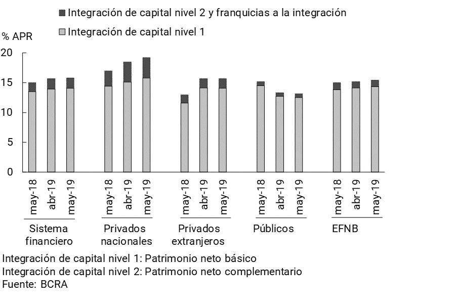 Los indicadores agregados de solvencia permanecieron en niveles elevados en mayo. La integración de capital del sistema financiero totalizó 15,8% de los activos ponderados por riesgo (APR) en el período, sin cambios significativos con respecto a abril y +0,9 p.p. i.a. (ver Gráfico 10). Entre los conceptos que componen la Responsabilidad Patrimonial Computable (RPC), el capital Nivel 1 siguió explicando casi 90% del total. En el mes la integración de capital representó 183% de la exigencia normativa, 8,8 p.p. más que en mayo de 2018.