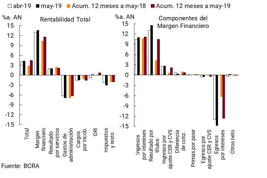Los gastos de administración del sistema financiero crecieron 0,7 p.p. del activo en el mes hasta alcanzar 6,9%a. En los últimos 12 meses estos egresos representaron 6,2% del activo, 0,6 p.p. menos que en igual período a mayo de 2018. Por su parte, los cargos por incobrabilidad se redujeron levemente en el mes hasta 1,5%a. del activo. Así, en línea con la evolución de la calidad de la cartera crediticia, en el acumulado entre junio de 2018 y mayo de 2019 estos cargos totalizaron 1,6% del activo, 0,4 p.p. de incremento interanual.