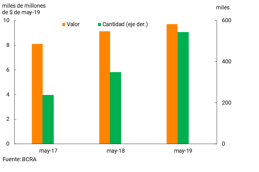 • En el mes el promedio diario de las transferencias inmediatas de fondos aumentó respecto a abril y en comparación con el mismo periodo de 2018 (+56,1% i.a. para la cantidad de operaciones y +6,2% i.a. para valores en términos reales).