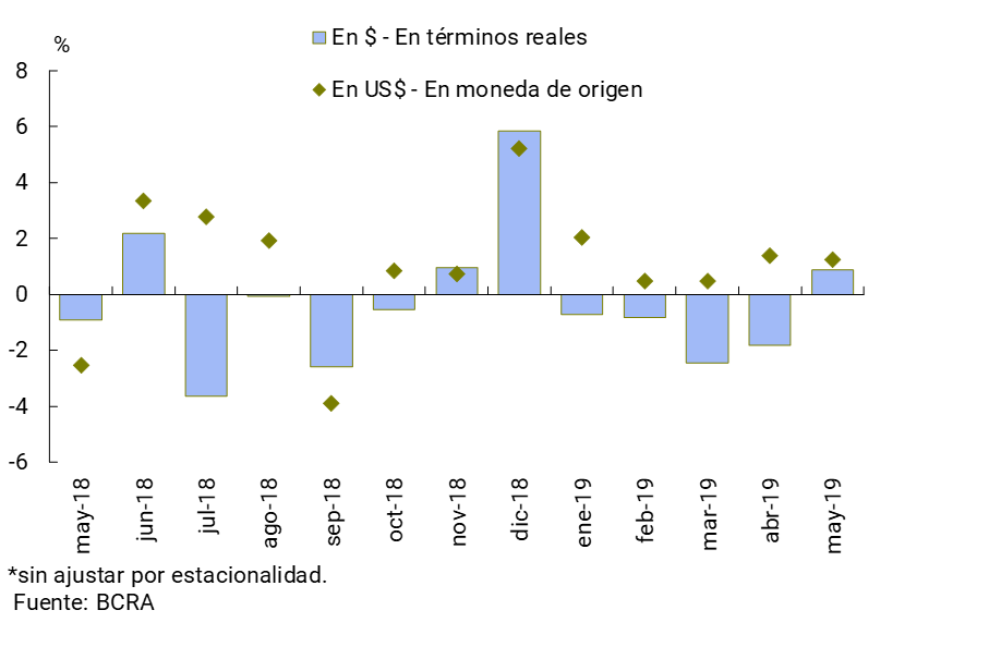 El saldo de crédito en pesos al sector privado disminuyó 2,5% en términos reales en mayo (+0,5% nominal), principalmente por el desempeño de las líneas comerciales y de los prendarios5. Las financiaciones en moneda extranjera se redujeron 1,7% en el mes (en moneda de origen, ver Gráfico 6).