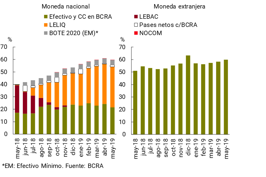 En mayo la ponderación de los depósitos del sector privado en el fondeo total —pasivo más patrimonio neto— del sistema financiero se ubicó en 60,6%, 1,7 p.p. por encima del registro de abril y 6,3 p.p. más con respecto a mayo de 2018. En el último año, las colocaciones en moneda extranjera y los depósitos a plazo en pesos incrementaron su participación dentro de los depósitos del sector privado, en detrimento de las cuentas a la vista en pesos.